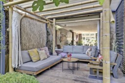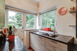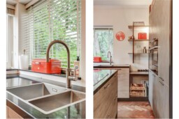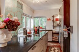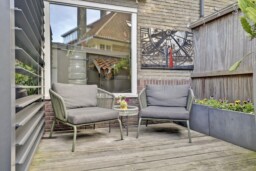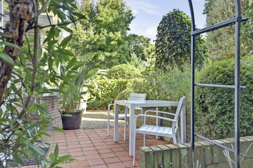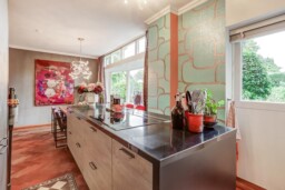 De woonkeuken is een droom voor kookliefhebbers. Het kookeiland met natuurstenen werkblad vormt het hart van de keuken, en alle apparatuur is van Bosch: inductiekookplaat, oven, magnetron, vaatwasser en bordenwarmer. Een Quooker maakt het geheel compleet. Vanuit de keuken loop je direct de voortuin in, ideaal voor een ontbijt in het ochtendzonnetje.