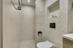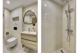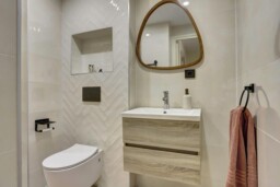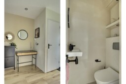 De badkamer (2023) is modern afgewerkt en voorzien van een inloopdouche, wastafel en tweede toilet.