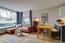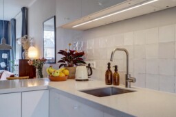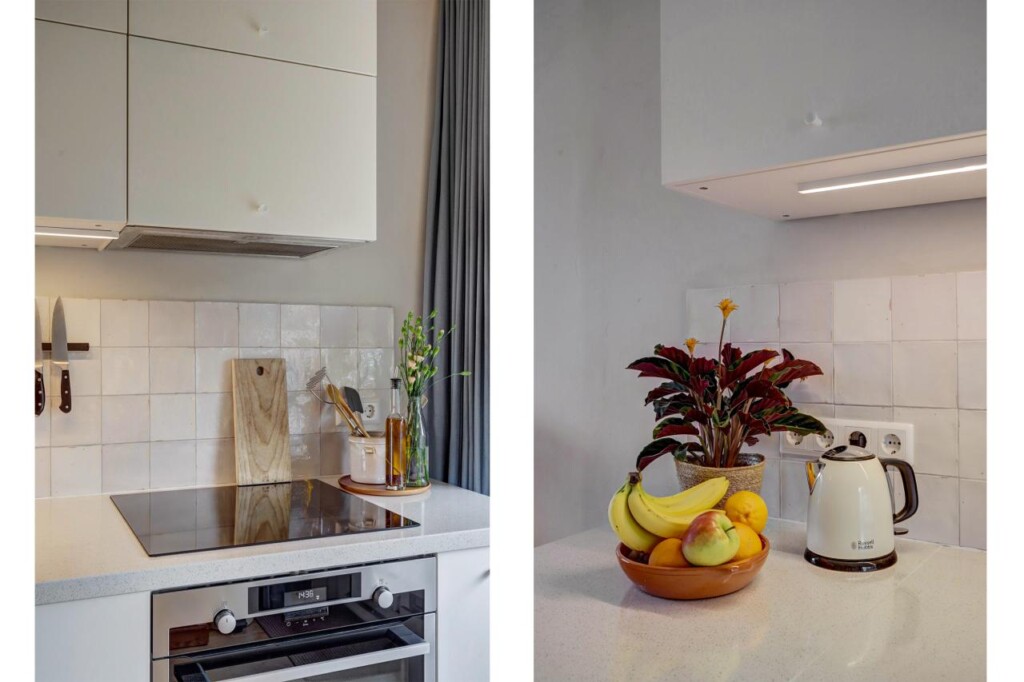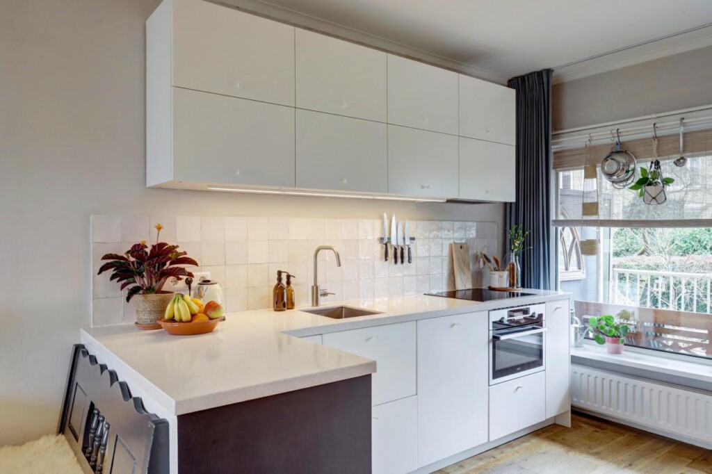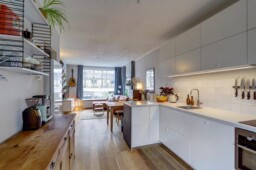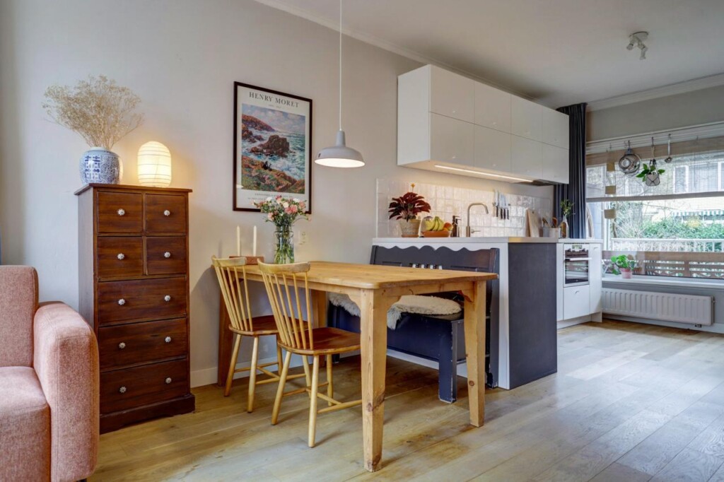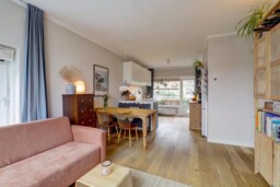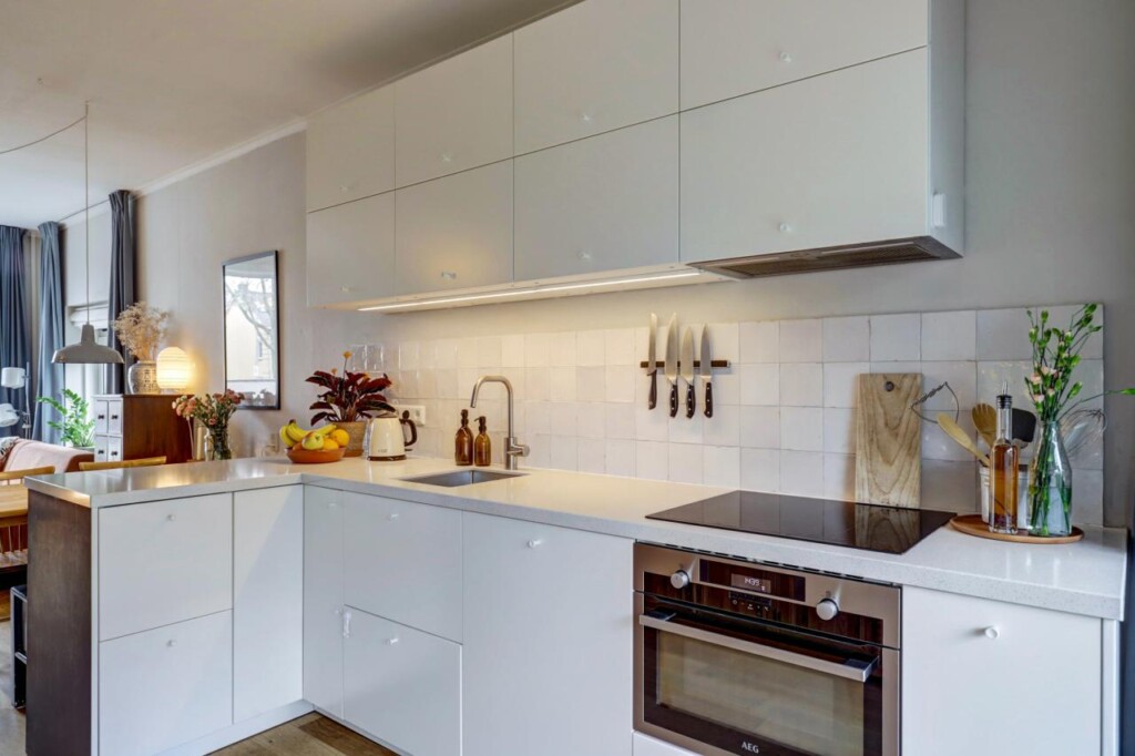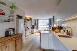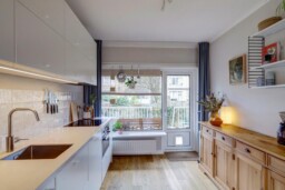 De keuken is volledig vernieuwd en voorzien van de benodigde inbouwapparatuur; de koelkast met vriezer is vrijstaand en weggewerkt in een nis, voorheen een bergkast. Door het verplaatsen van de keuken is een tweede slaapkamer gecreëerd, waardoor het appartement ideaal is voor een klein gezin, stel of thuiswerkende bewoner.