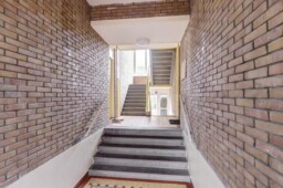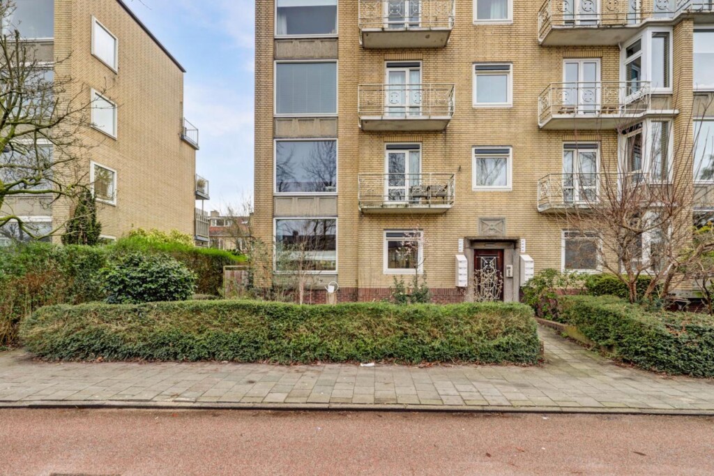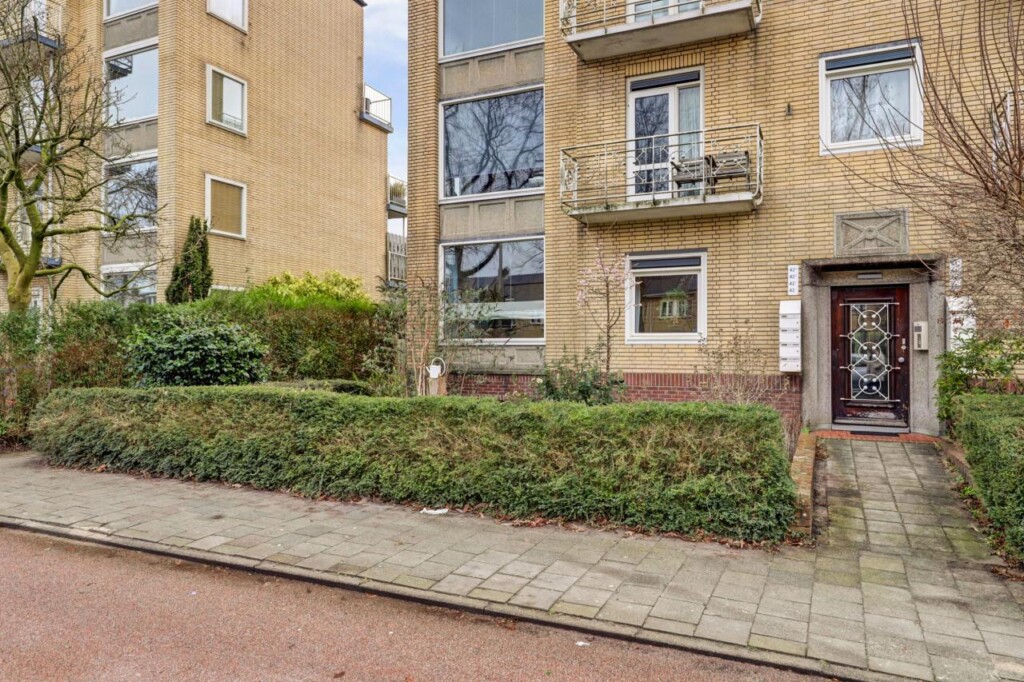 Via het bellentableau is het afgesloten complex te bereiken. Vanaf de entree leiden enkele traptreden naar het appartement, dat iets hoger ligt dan de centrale ingang, maar zich op de laagstgelegen woonverdieping van het gebouw bevindt.