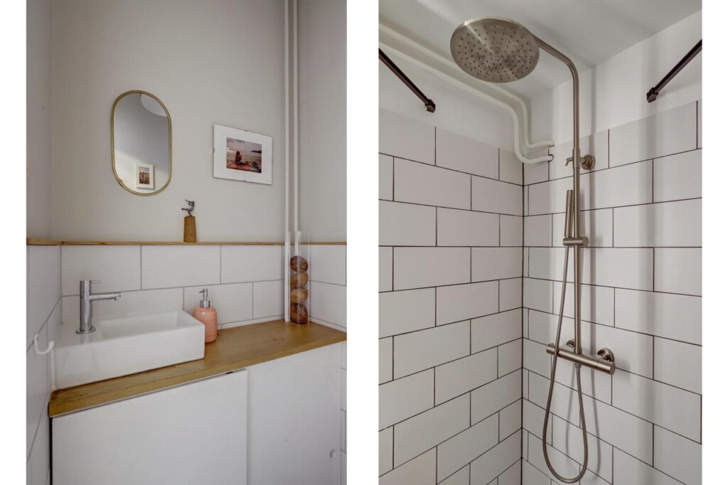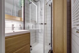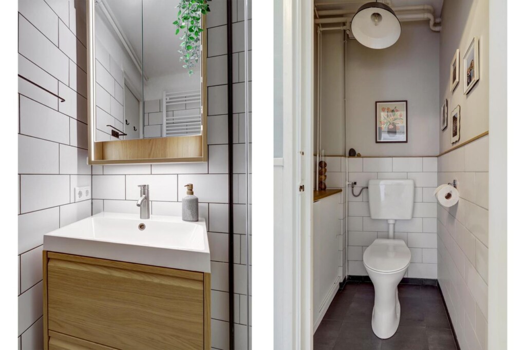 De badkamer is vernieuwd in 2024 en netjes afgewerkt met een douchecabine met regendouche, wastafelmeubel met bijpassende spiegelkast met ingebouwde verlichting, een hoge kast en een handdoekradiator. Alles is betegeld in neutrale kleuren. Het separate toilet is betegeld met soortgelijke tegels en voorzien van een wasbakje, inclusief extra opbergruimte in een kast over de gehele lengte.