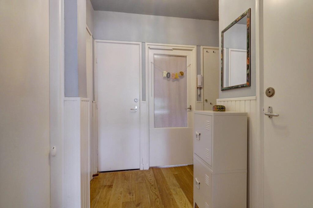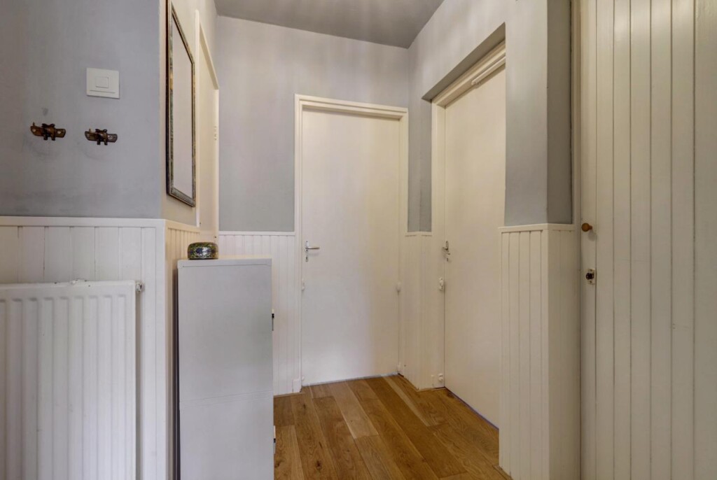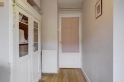 Via de voordeur kom je in de hal. Vanuit hier is toegang tot bijna alle vertrekken: de slaapkamers, het separate toilet, de badkamer en de woonkamer. De hal is compact, waardoor er relatief meer vierkante meters beschikbaar zijn als woonruimte. Rechtdoor loop je de woonkamer in, met de keuken direct aangrenzend (door huidige bewoners naar de woonkamer verplaatst).
