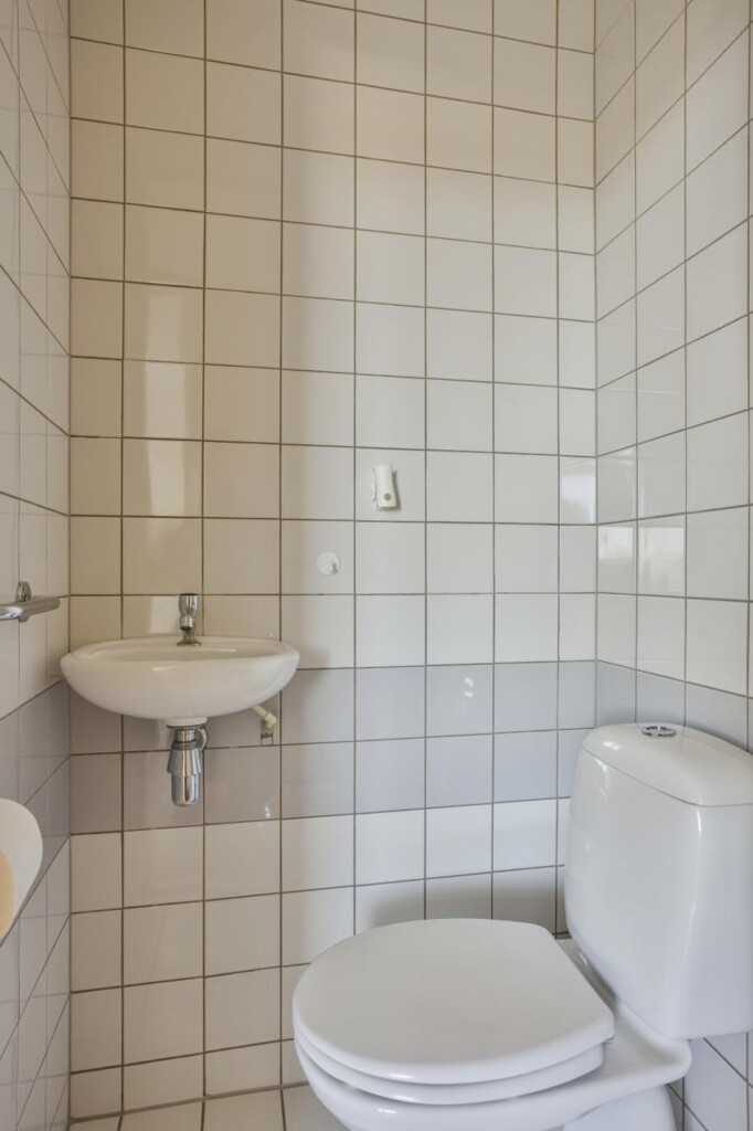 De badkamer is geheel betegeld en ingericht met een bad-/douchecombinatie en een wastafelmeubel met dubbele kraan. Tot slot is er nog een inpandige berging aanwezig,