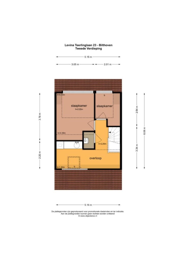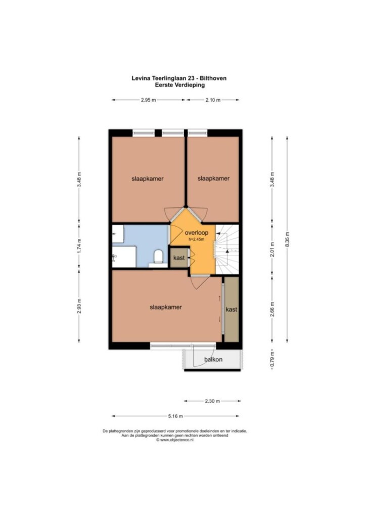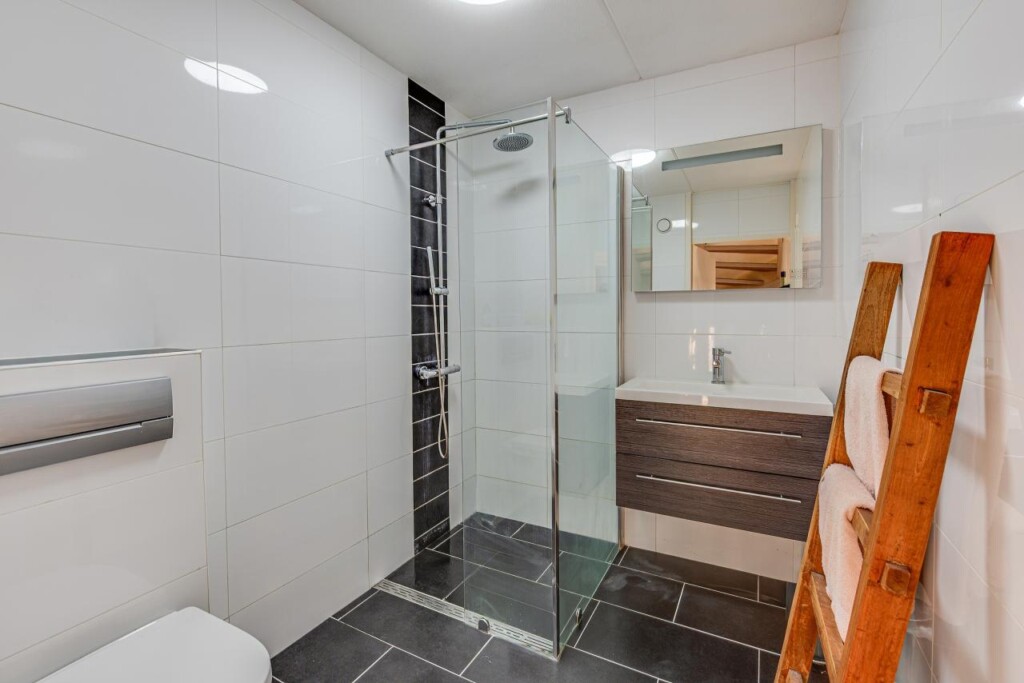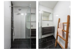 Eerste verdieping: overloop, drie in grootte variërende slaapkamers, badkamer met ruime douche, wastafel en een tweede toilet.