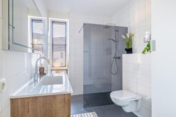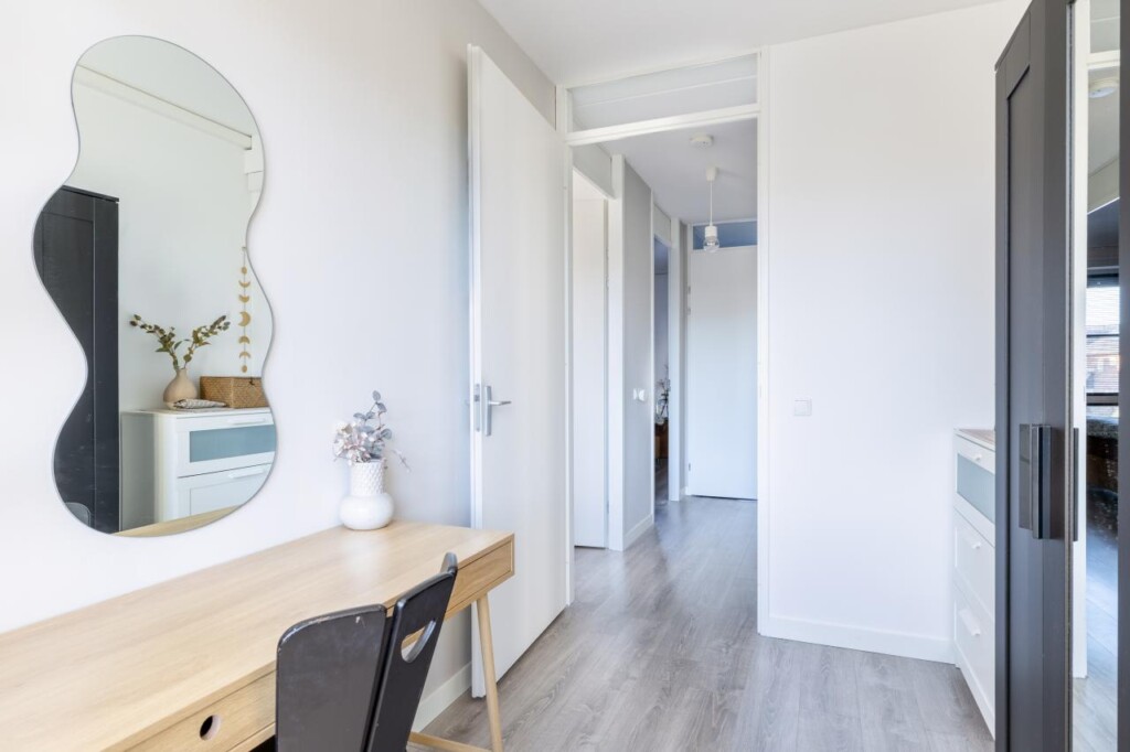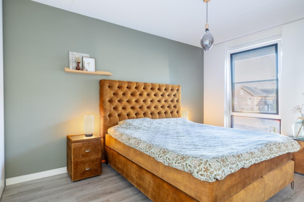 Op de eerste verdieping bevinden zich drie comfortabele slaapkamers, stuk voor stuk licht en prettig van formaat. De hoofdslaapkamer ligt aan de voorzijde en is voorzien van een ruime ingebouwde wandkast. De andere kamers doen hier echter niet voor onder en zijn uitstekend geschikt als kinder-, werk- of logeerkamer. De badkamer is modern en fris uitgevoerd met een inloop-regendouche, wastafelmeubel met verlichte spiegel en een wandcloset. Dankzij het daglicht en de rustige afwerking is dit een ruimte waar je ’s ochtends ontspannen begint en ’s avonds tot rust komt.