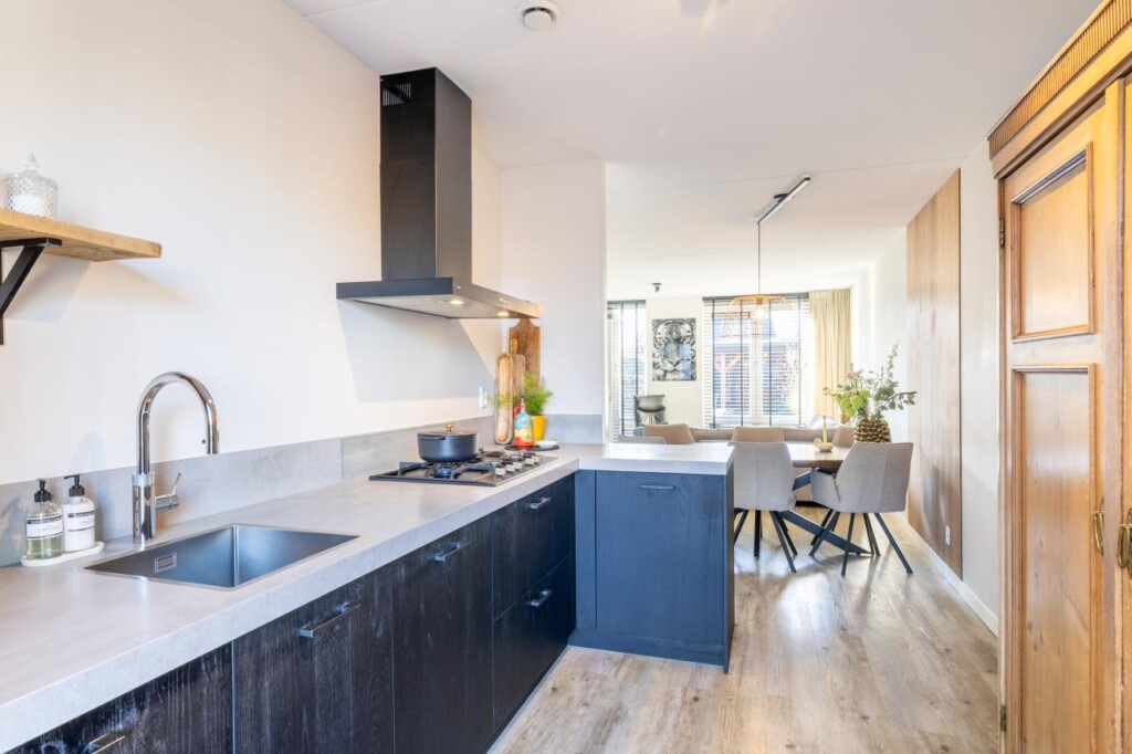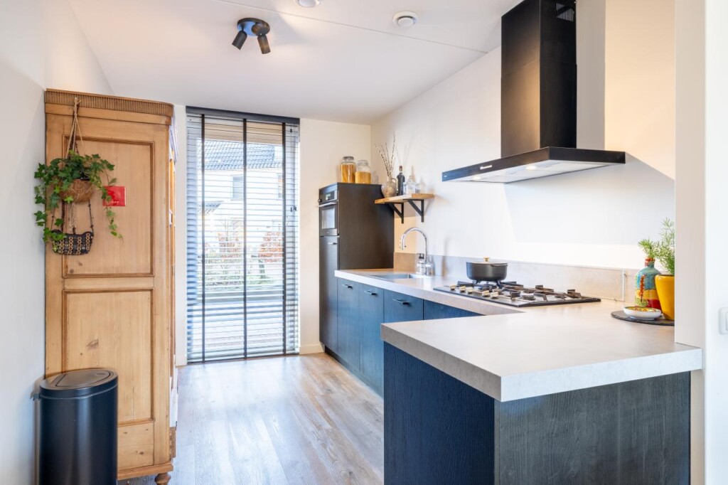 Je komt binnen in een nette hal die direct de toon zet: strak, verzorgd en licht. Hier vind je het toilet, de trapopgang en toegang tot het leefgedeelte middels een eigentijdse deur. Zodra je de woonkamer binnenloopt, voel je de ruimte. Grote raampartijen zorgen voor een prettige lichtinval en geven zicht op de achtertuin, waardoor binnen en buiten naadloos in elkaar over lijken te lopen. De woonkamer biedt volop plek voor een royale zithoek én een grote eettafel. Aan de voorzijde ligt de keuken; ingericht met een modern hoekmeubel en uitgerust met hoogwaardige inbouwapparatuur, zoals een gaskookplaat, afzuigkap, combi-oven, koelkast en vaatwasser. Een prettig ingedeelde keuken die goed aansluit op het dagelijkse leven in huis. In de woonkamer beschik je tevens over een praktische trapkast, ideaal voor je voorraadopslag.