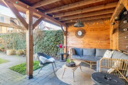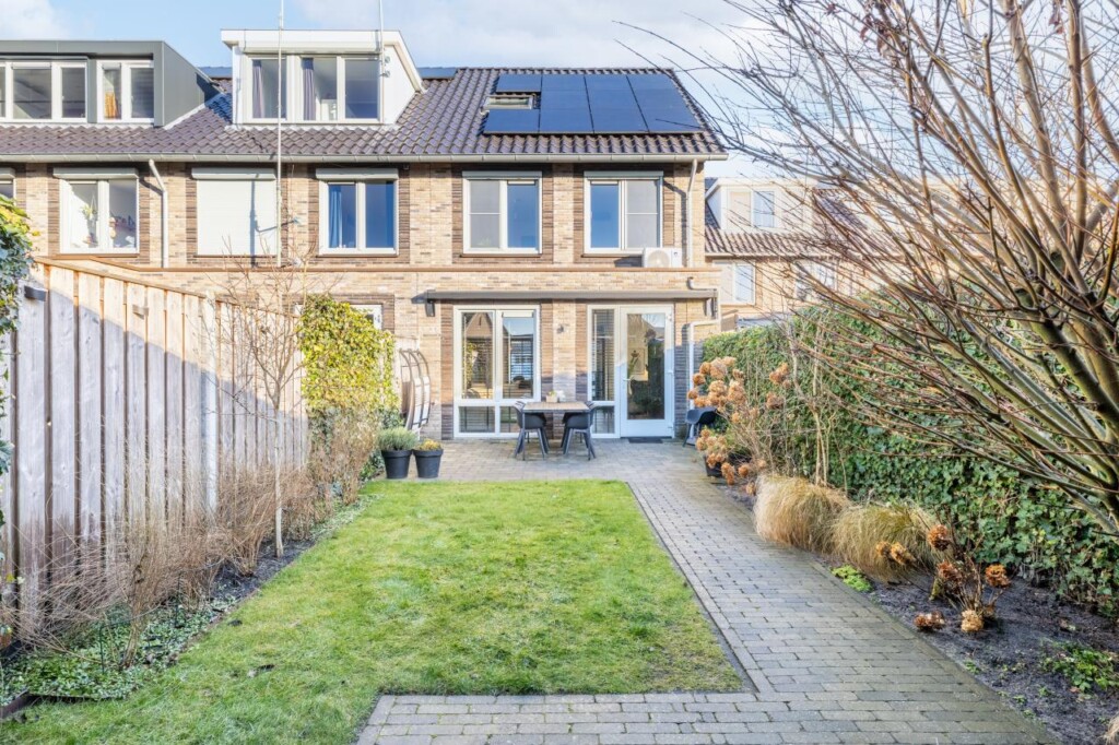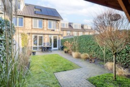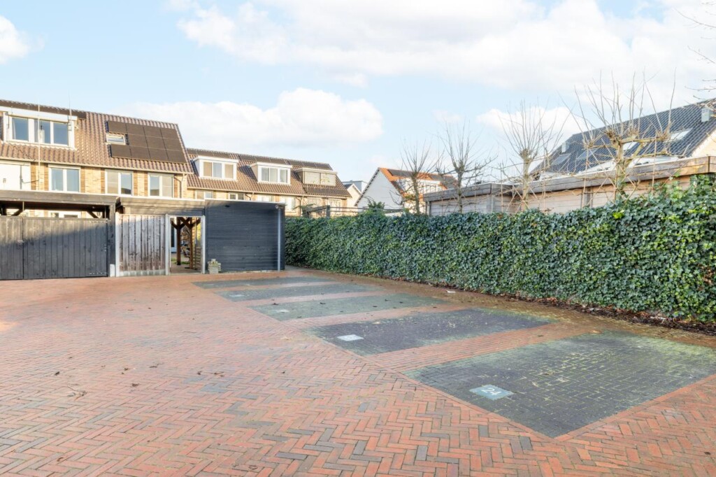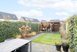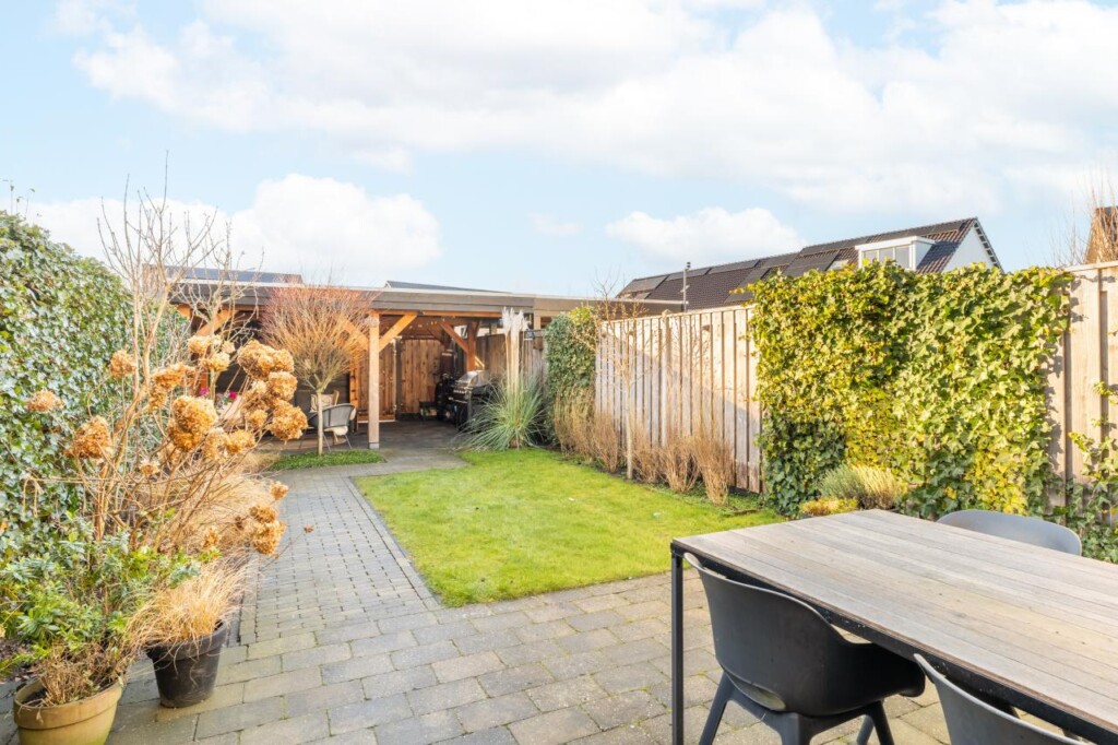 De achtertuin is verzorgd en doordacht aangelegd, met een fijne mix van groen en bestrating. Er is ruimte voor meerdere zitplekken, waardoor je de zon of juist de schaduw kunt opzoeken. Achterin staat een robuuste overkapping, zonder twijfel één van de fijnste plekken van het huis. Hier zit je beschut, sfeervol en ontspannen, of het nu zomer is of een frisse avond in het voor- of najaar. Dit is zo’n tuin die echt gebruikt wordt en die het woonplezier zichtbaar vergroot. Opbergruimte vind je terug in de berging en er is een praktische achterom voor extra comfort, die je overigens direct naar jouw eigen parkeerplaats leidt.
