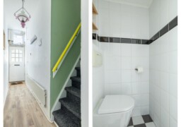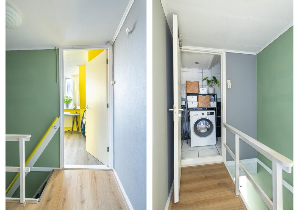 In het trappengat bevindt zich een luik dat toegang geeft tot extra bergruimte. Deze praktische opbergplek is ideaal voor spullen die je niet dagelijks nodig hebt en draagt bij aan een opgeruimd en overzichtelijk huis.