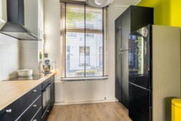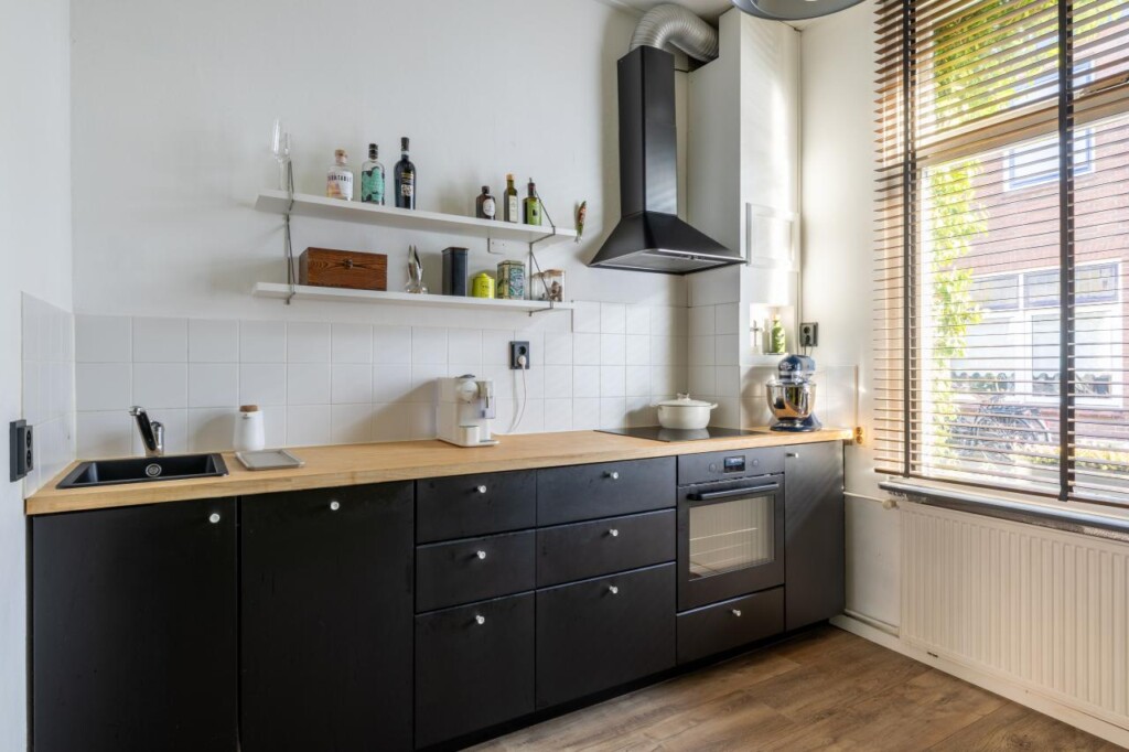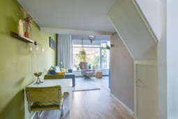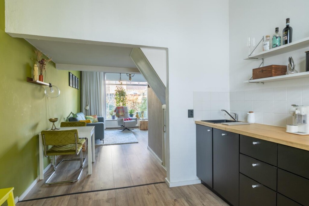 De entree brengt je in een opvallend diepe hal, waar de indeling direct logisch aanvoelt. Hier bevinden zich het toilet, de trapopgang en de toegang tot het leefgedeelte, terwijl het hoge plafond zorgt voor een rustige, open uitstraling. De hal vormt een prettige aanloop naar de woonkamer aan de tuinzijde, waar grote raampartijen en de tuindeur zorgen voor veel daglicht en een fijne verbinding met buiten. In het middendeel van de woning is ruimte voor een eettafel, waardoor wonen en koken op een natuurlijke manier in elkaar overlopen. Aan de voorzijde ligt de keuken, geplaatst in 2020 en uitgevoerd in een moderne, strakke stijl. Met een inductiekookplaat, heteluchtoven en vaatwasser is deze overzichtelijk ingericht en prettig in gebruik voor het dagelijks leven.