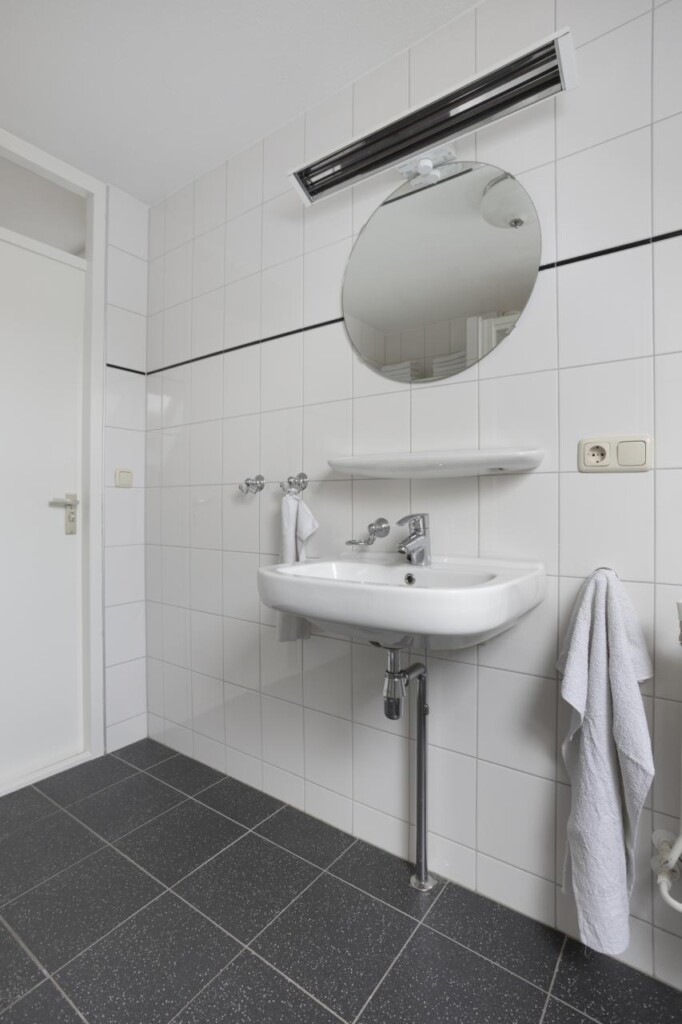 De ruime badkamer grenst aan de overloop en is volledig betegeld. Deze is voorzien van een royale douchecabine, ligbad, wastafel met spiegel en een staand toilet. De nette en neutrale afwerking biedt een solide basis, die desgewenst naar eigen smaak gemoderniseerd kan worden.