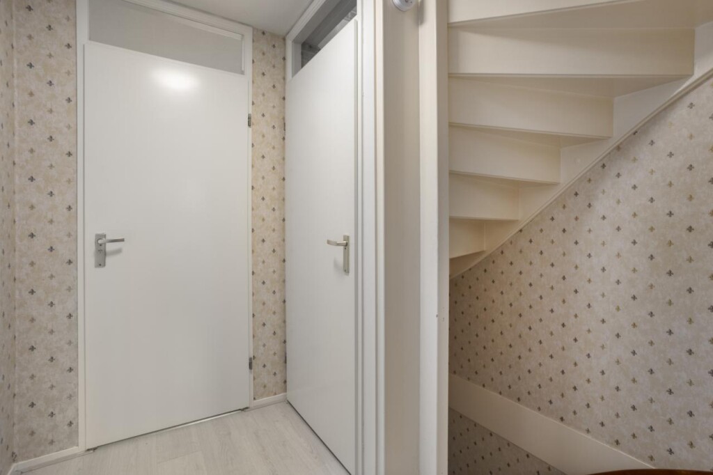 Aan de achterzijde van de woning bevindt zich een tweede hal. Deze biedt toegang tot de toiletruimte, de trap naar de eerste verdieping en de praktische bijkeuken. Deze extra hal maakt het wonen efficiënt en zorgt voor een logische indeling van de begane grond.