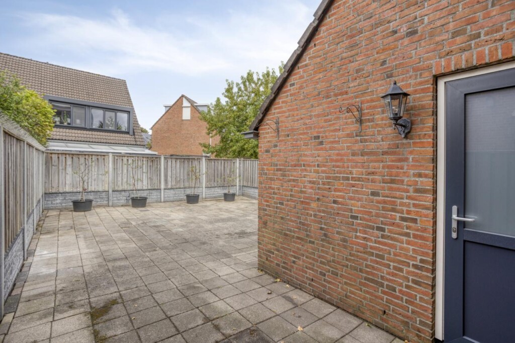 De achtertuin is bereikbaar via de hal aan de achterzijde en biedt een aangename mix van groen en onderhoudsarm bestrate oppervlakken. Het terras is ruim genoeg voor een buitentafel of loungeset en profiteert van veel zonuren. De tuin is voorzien van een degelijke schutting (geplaatst ca. 6 jaar geleden) met zowel een achteringang _ breed genoeg om een auto, caravan of aanhanger naar binnen te rijden (geen officiële inrit) _ als een doorgang aan de voorzijde. Hierdoor is de buitenruimte zowel praktisch als sfeervol.
