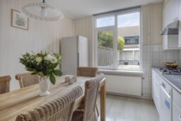 Een open keuken aan de achterzijde grenst direct aan de eetkamer en is voorzien van een langwerpig aanrecht met gasfornuis, afzuigkap, spoelbak met kraan en vaatwasser. De losstaande koelkast maakt het geheel compleet. Hoewel de keuken ruim en functioneel is, biedt deze tevens de mogelijkheid voor modernisering naar eigen smaak.