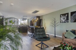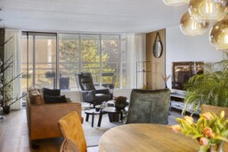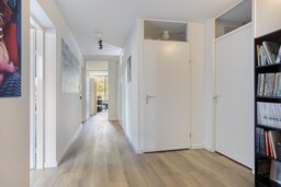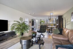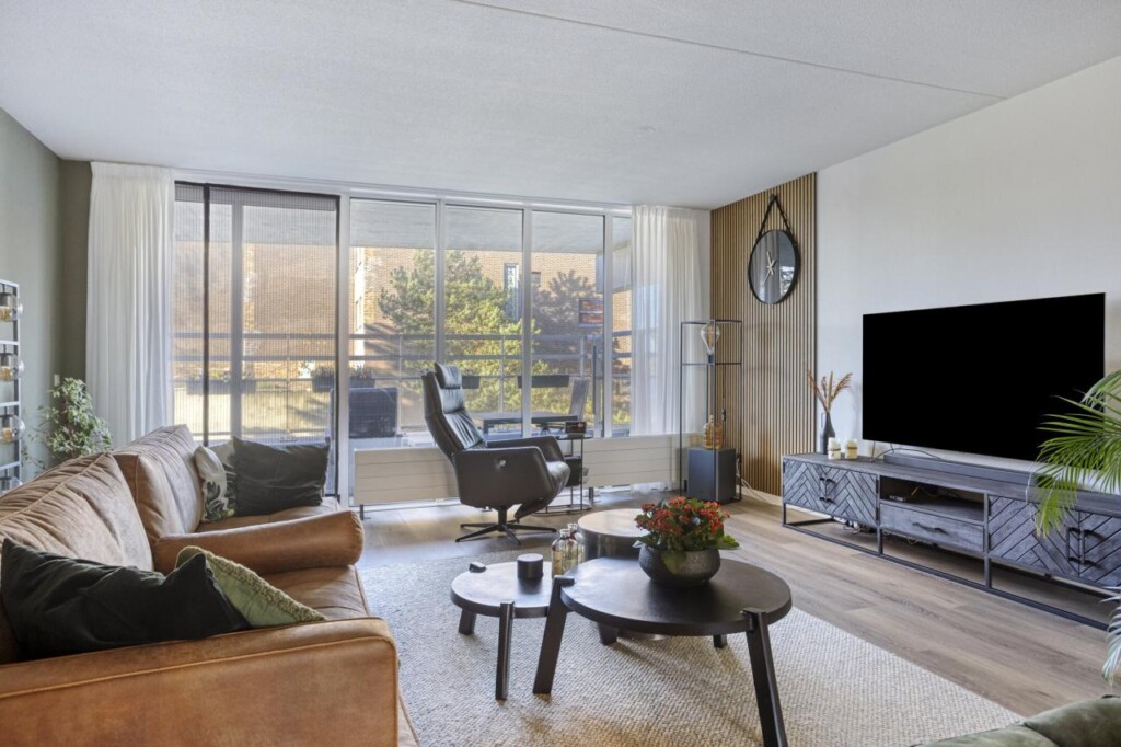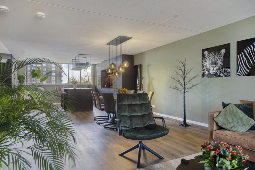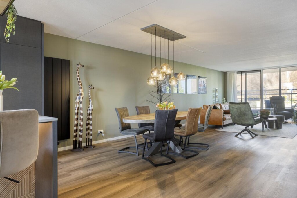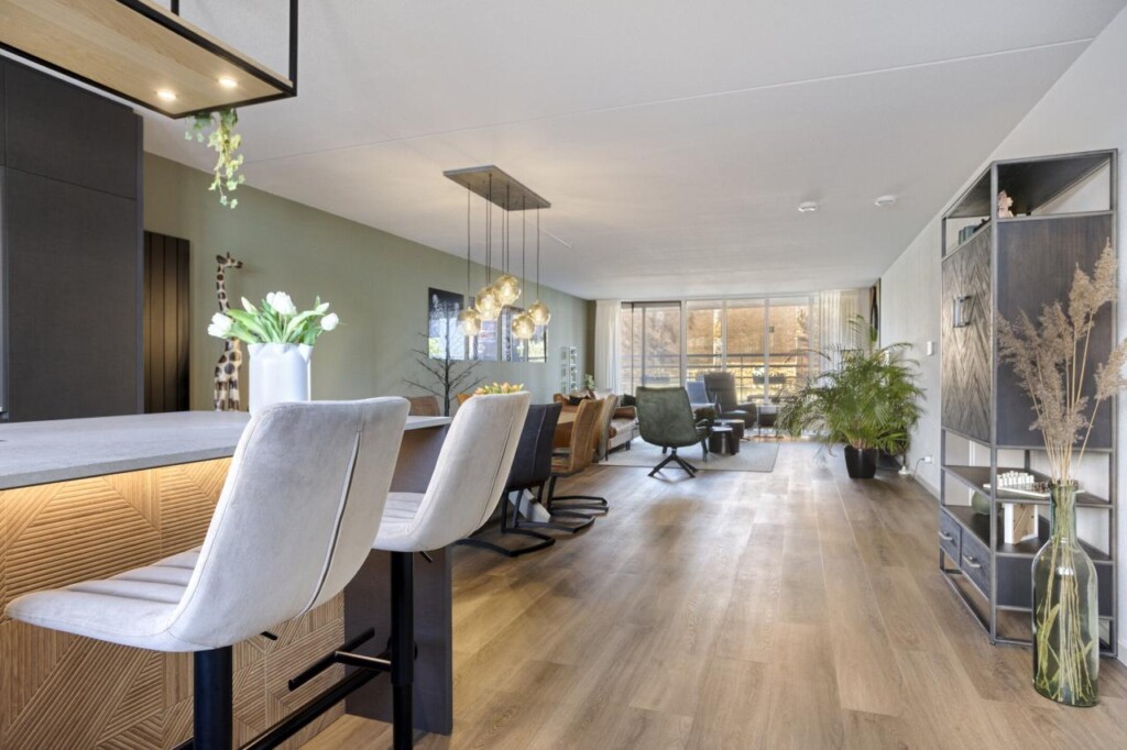 Zodra je de voordeur opent, merk je het meteen: dit is geen standaard appartement. De royale entreehal voelt rustig aan en vormt een prettige binnenkomst, met van hieruit toegang tot alle vertrekken. Je loopt door richting de woonkamer en daar zet het gevoel zich voort. De ruimte opent zich volledig en laat meteen zien hoe indrukwekkend groot dit appartement is. De brede raampartijen zorgen voor een overvloed aan daglicht en geven de leefruimte een open, luchtig karakter, waarbij wonen en leven moeiteloos in elkaar overlopen.