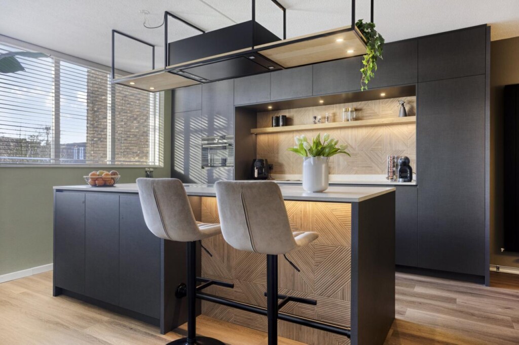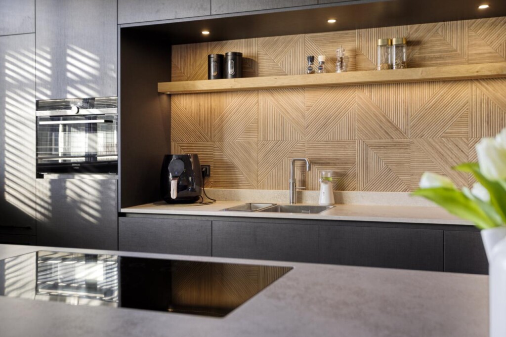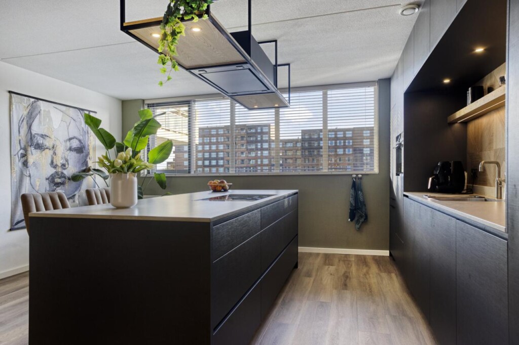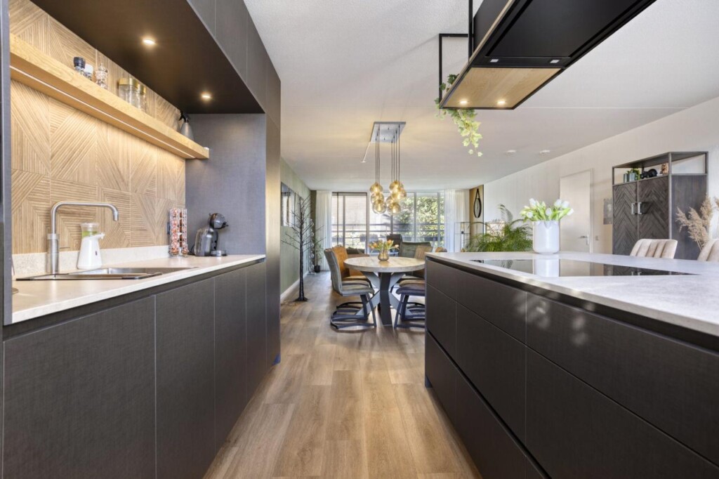 De woonkamer biedt meer dan genoeg plek voor een royale zithoek én een grote eettafel. Hier ontvang je vrienden, vier je lange diners en geniet je van het dagelijkse comfort van een ruimte die klopt in verhouding en sfeer. En dan de keuken. Dit is er eentje die direct de aandacht pakt. Strak, modern en uitgesproken, met een royaal kookeiland als absoluut middelpunt. Hier kook je niet alleen, hier beleef je het koken. Het eiland biedt veel werkruimte en maakt de keuken een sociale plek waar je moeiteloos aanschuift met een glas wijn. De keuken is uitgerust met hoogwaardige inbouwapparatuur, waaronder een inductiekookplaat, industriële afzuigkap, combi-oven, koel-/vriescombinatie, Quooker en vaatwasser, alles fraai weggewerkt en perfect op elkaar afgestemd.