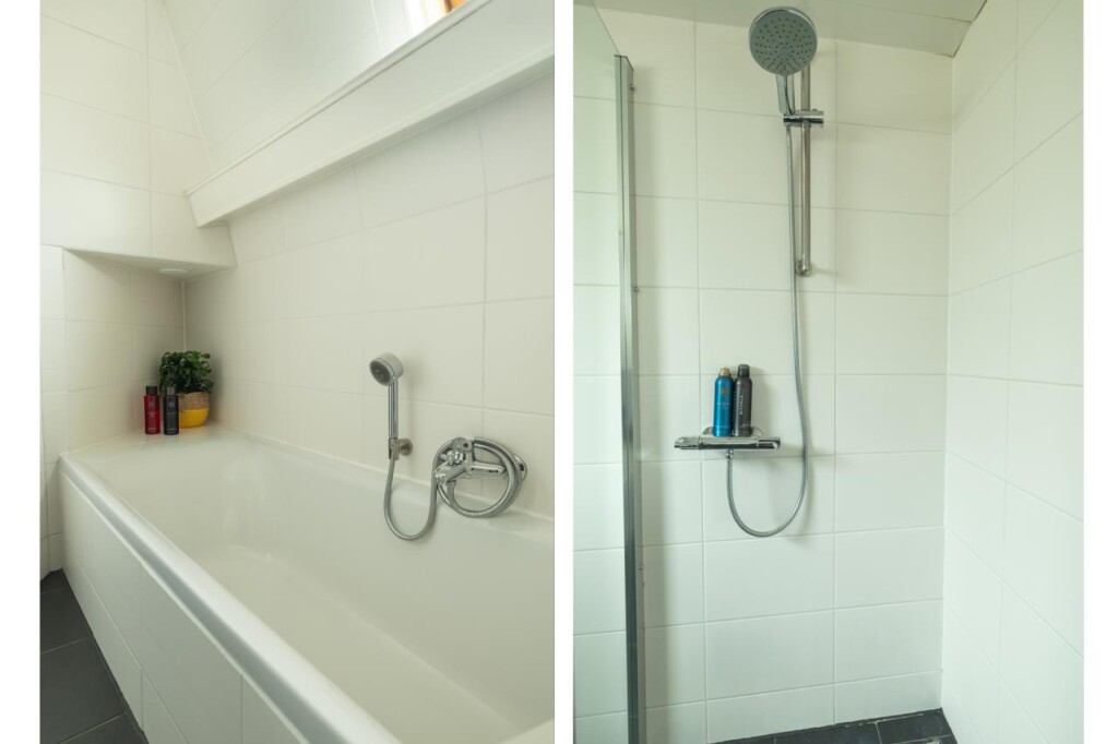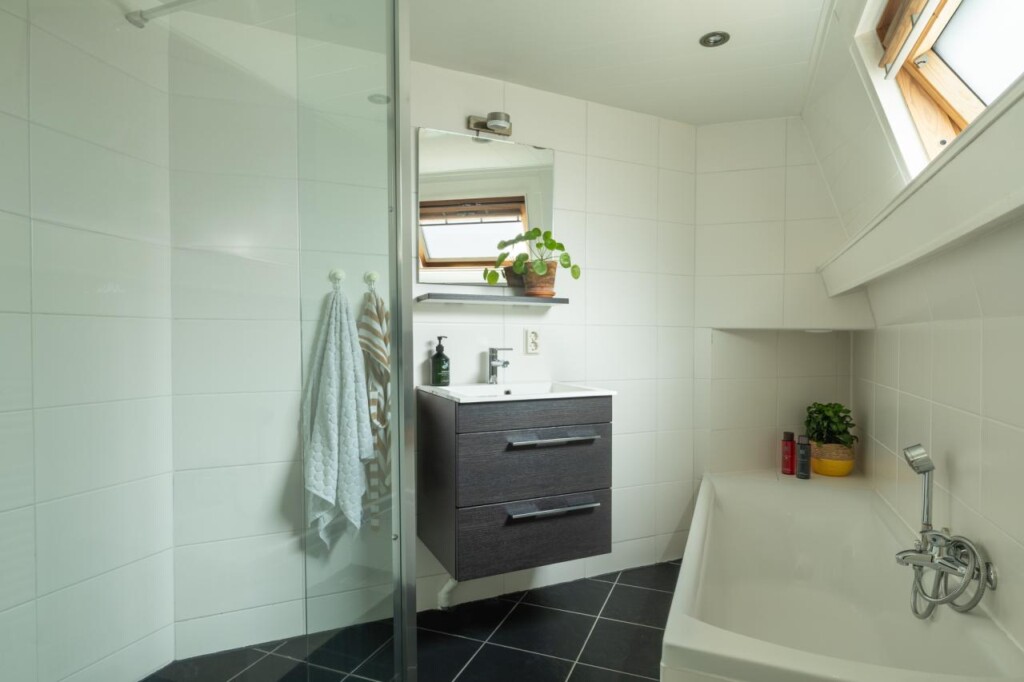 Boven vind je twee fijne slaapkamers en een aparte werkkamer _ perfect voor thuiswerken of als babykamer. De kamers zijn licht afgewerkt met houten vloeren, met genoeg ruimte voor kasten en een bed. De badkamer heeft een frisse, moderne uitstraling en is voorzien van een ligbad, aparte douche en wastafelmeubel. Dankzij het dakraam valt er veel daglicht binnen, wat de ruimte een ontspannen sfeer geeft.