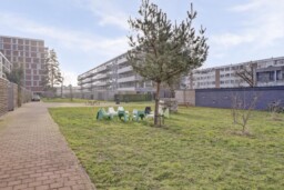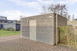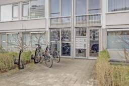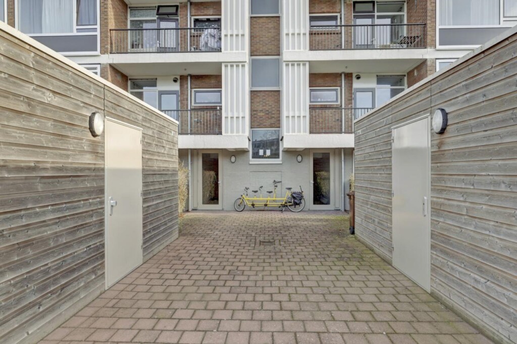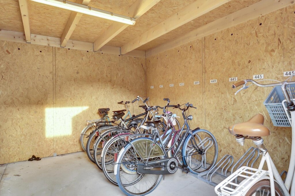 Aan de achterzijde van het complex bevindt zich een gezamenlijke binnentuin met een fietsenberging voor vier appartementen. Elk appartement heeft een eigen fietsenrek met ruimte voor twee fietsen.