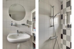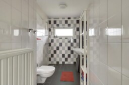De badkamer is netjes afgewerkt en voorzien van een toilet, een inloopdouche en een wastafel.
