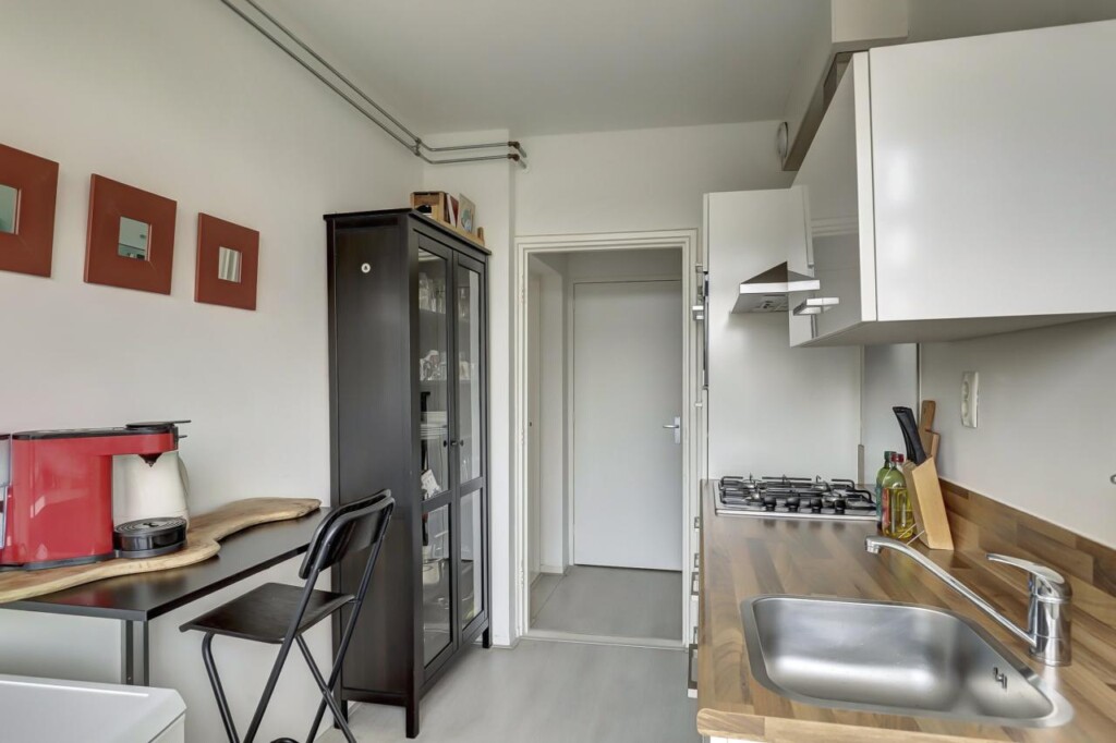 Aan de tuinzijde is de keuken, uitgevoerd in neutrale kleuren en voorzien van alle benodigde inbouwapparatuur. Er is een bar geplaatst, geschikt om aan te zitten of bijvoorbeeld als koffiebarretje, zoals deze nu in gebruik is. Vanuit de keuken is er toegang tot het balkon.
