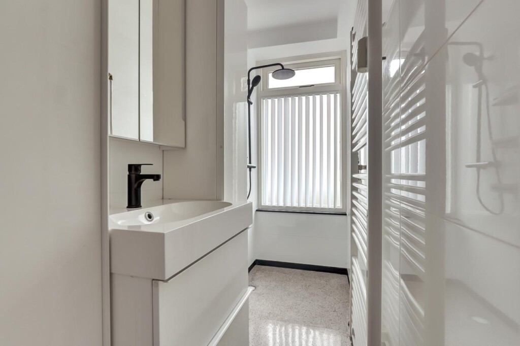 De badkamer is netjes uitgevoerd met een douche, wastafelmeubel en designradiator; het toilet is separaat.