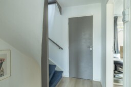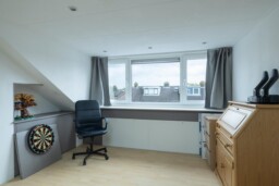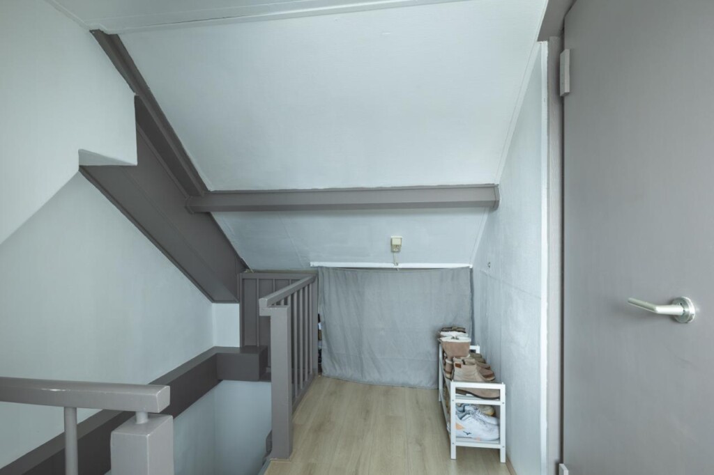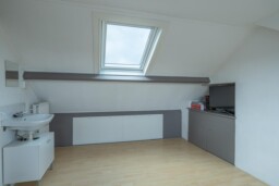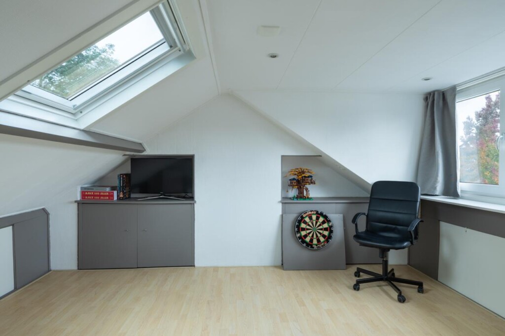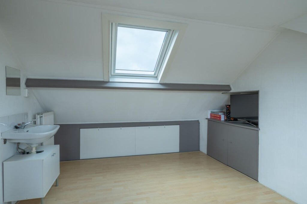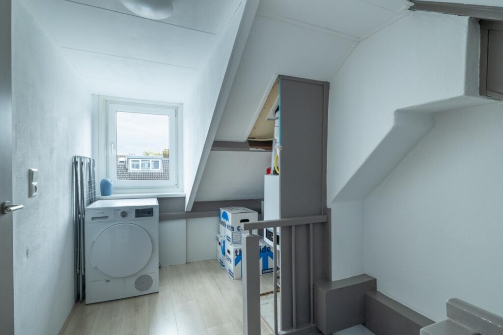 De tweede verdieping is een volwaardige woonlaag dankzij de brede dakkapel (geplaatst in 2019) over de gehele achterzijde. De royale zolderkamer is voorzien van een eigen wastafel en leent zich goed als derde volwaardige slaapkamer. Op de overloop is de cv-installatie gesitueerd, en ook vind je hier handige bergruimte achter de knieschotten.