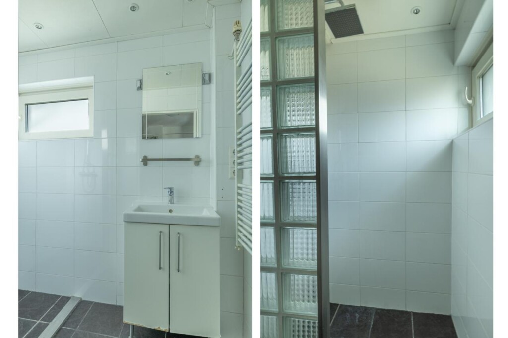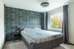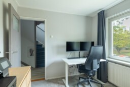 Op de eerste verdieping vind je twee ruime slaapkamers, elk met kunststof kozijnen en een prettige lichtinval. De hoofdslaapkamer aan de achterzijde heeft een rustige sfeer en biedt uitzicht op de tuin. De tweede kamer aan de voorzijde is perfect als kinder- of logeerkamer, en daarnaast is er een extra kamer op deze verdieping aanwezig; ideaal als werk- en kastenkamer. De badkamer oogt fris, is volledig betegeld en voorzien van een inloop regendouche, wastafelmeubel en designradiator.
