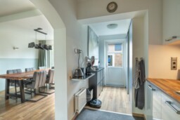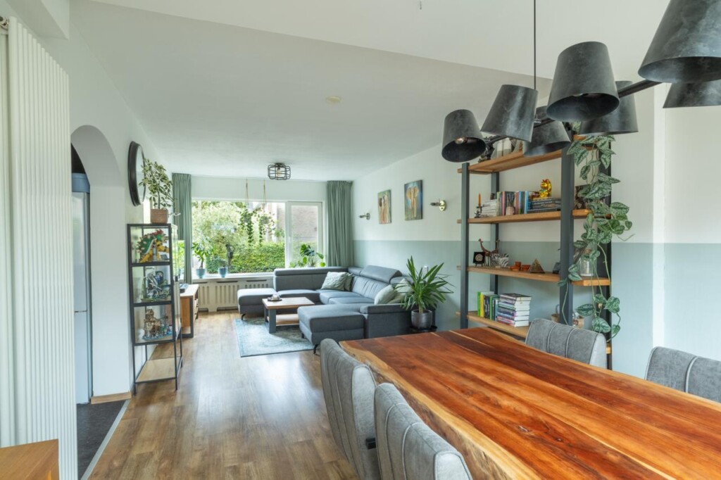Je stapt binnen in een nette hal met toiletruimte, trapopgang en handige trapkast. Vervolgens kom je in de uitgebouwde woonkamer, waar het meteen opvalt hoe ruim en licht het is, mede door de grote raampartij aan de voorzijde. De schuifpui aan de achterzijde zorgt voor een open verbinding met de tuin en laat ook veel daglicht binnen. Aan de voorzijde is ruimte voor een gezellige zithoek, terwijl je aan de achterkant comfortabel kunt dineren met uitzicht op de tuin. De halfopen keuken is praktisch ingedeeld met een recht keukenmeubel, en uitgerust met diverse inbouwapparatuur, waaronder een gaskookplaat, afzuigkap en oven. De grote bergkast in de uitbouw biedt verrassend veel opbergruimte.