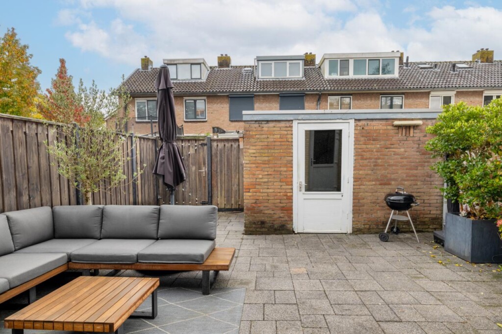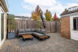 De achtertuin is strak aangelegd en volledig bestraat _ onderhoudsarm en ideaal voor lange zomeravonden. Dankzij de gunstige ligging geniet je van zon én privacy. Achter in de tuin staat een stenen berging met ruimte voor fietsen en tuingereedschap. Via de achterom loop je direct naar een ruim parkeerterrein, waar altijd plek is voor de auto.