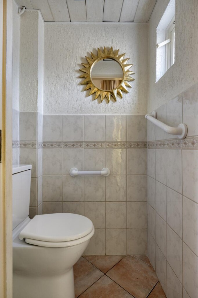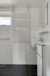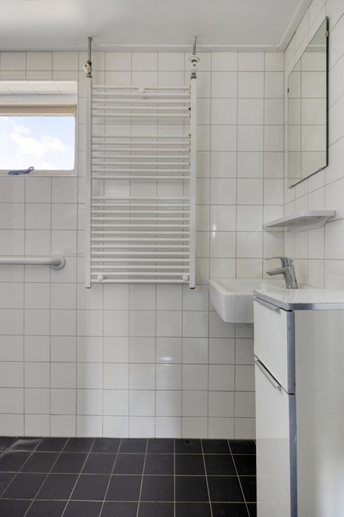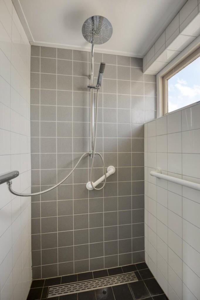 De badkamer is volledig betegeld en beschikt over een douche, wastafel en designradiator. Het raam zorgt voor daglicht en natuurlijke ventilatie.