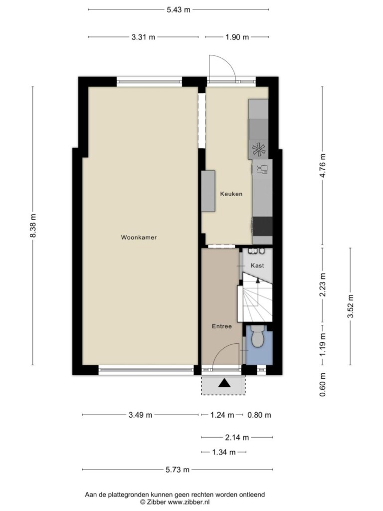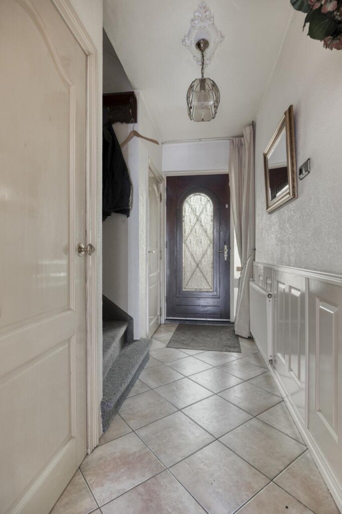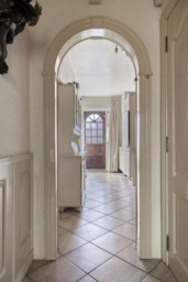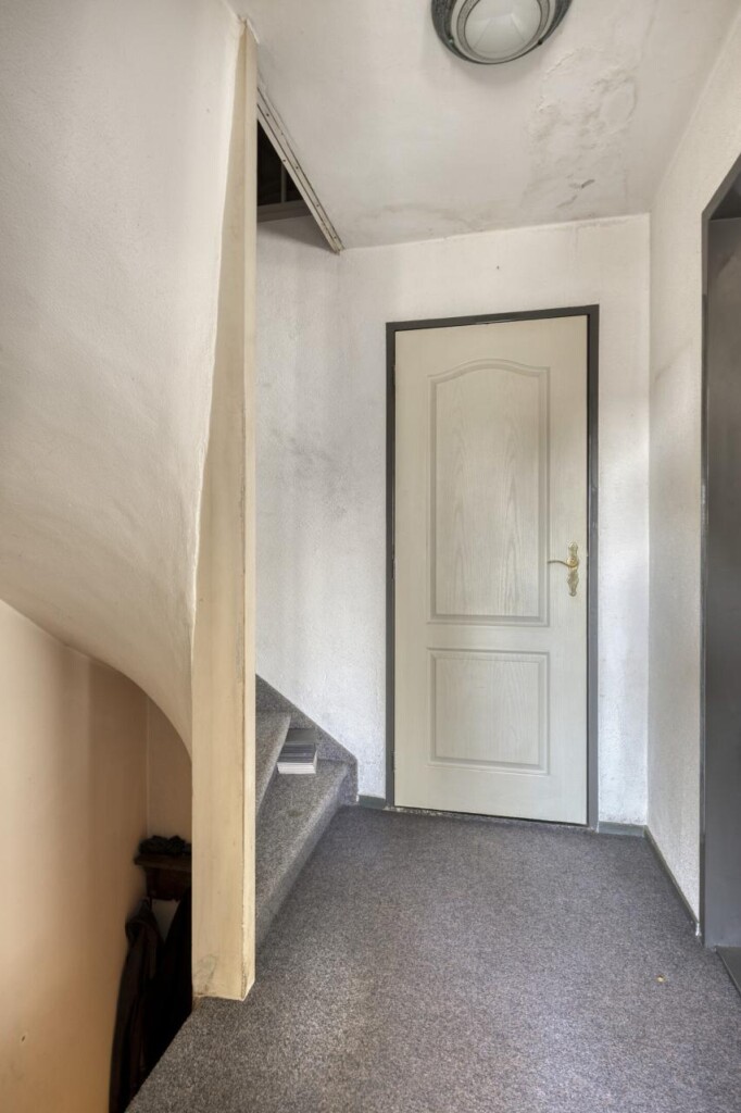 Je komt binnen in de hal. Vanuit hier bereik je de keuken, het toilet en de trap naar boven.