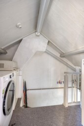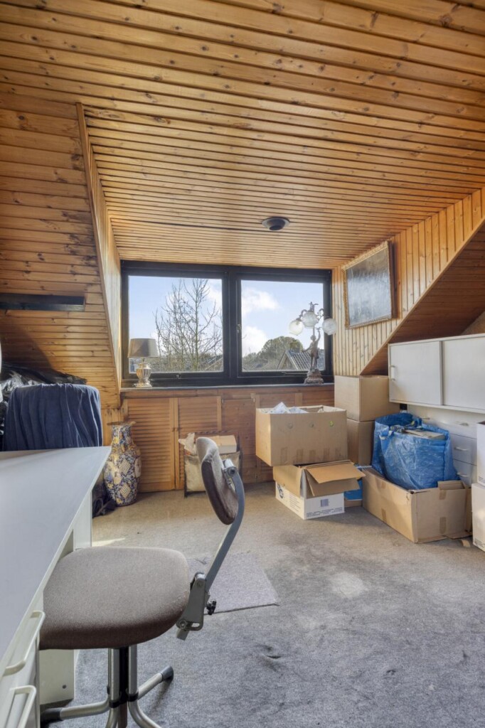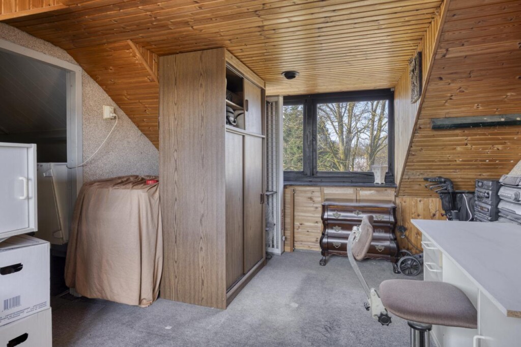 Via een vaste trap kom je op de voorzolder met aansluiting voor de wasmachine en extra bergruimte. Daarnaast bevindt zich hier een vierde slaapkamer. Dankzij twee dakkapellen is deze kamer licht en ruim. Achter de knieschotten is extra opbergruimte aanwezig.