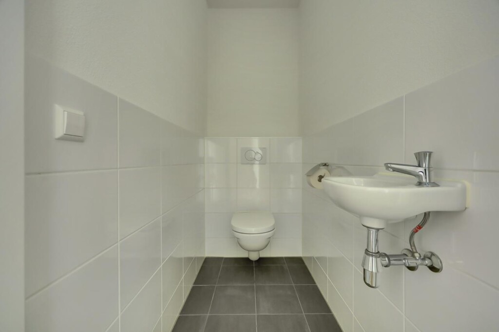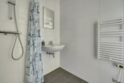 Centraal gelegen bevindt zich de badkamer, voorzien van een douche en wastafel, uitgevoerd in een neutrale kleurstelling. Het toilet is separaat.
