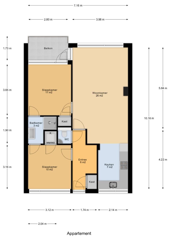 Door de praktische indeling sluit de woonkamer naadloos aan op de open leefkeuken. Met een woonoppervlakte van 69 m² en twee ruime slaapkamers is dit een comfortabele woning voor zowel starters, stellen als kleine gezinnen.